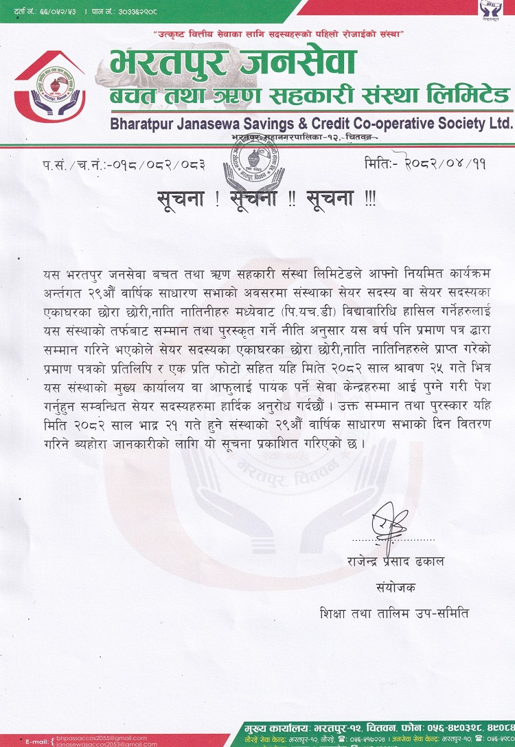 सदस्यका छोराछोरी, नातिनातिनाहरु लाई सस्थाको २९औ बार्षिक साधारणसाभामा सम्मान गर्ने कायक्रम रहेकोले आ.ब. २०८१/०८२ मा प्राप्त गरेको प्रमाणपत्रको प्रतिलिपि